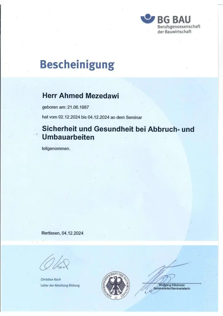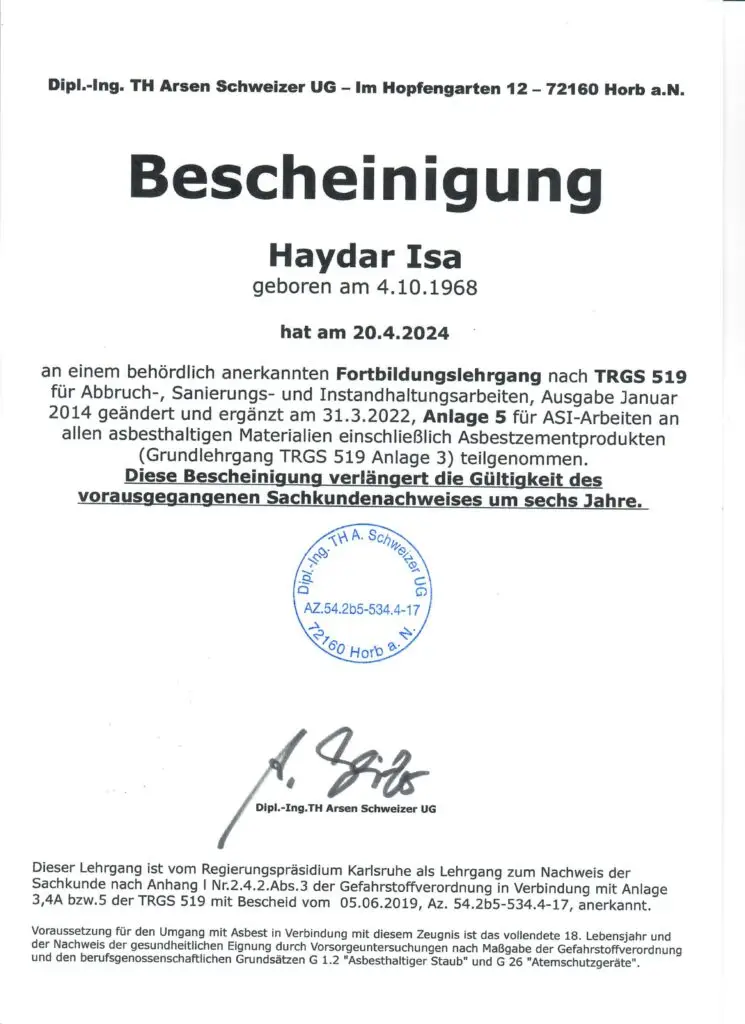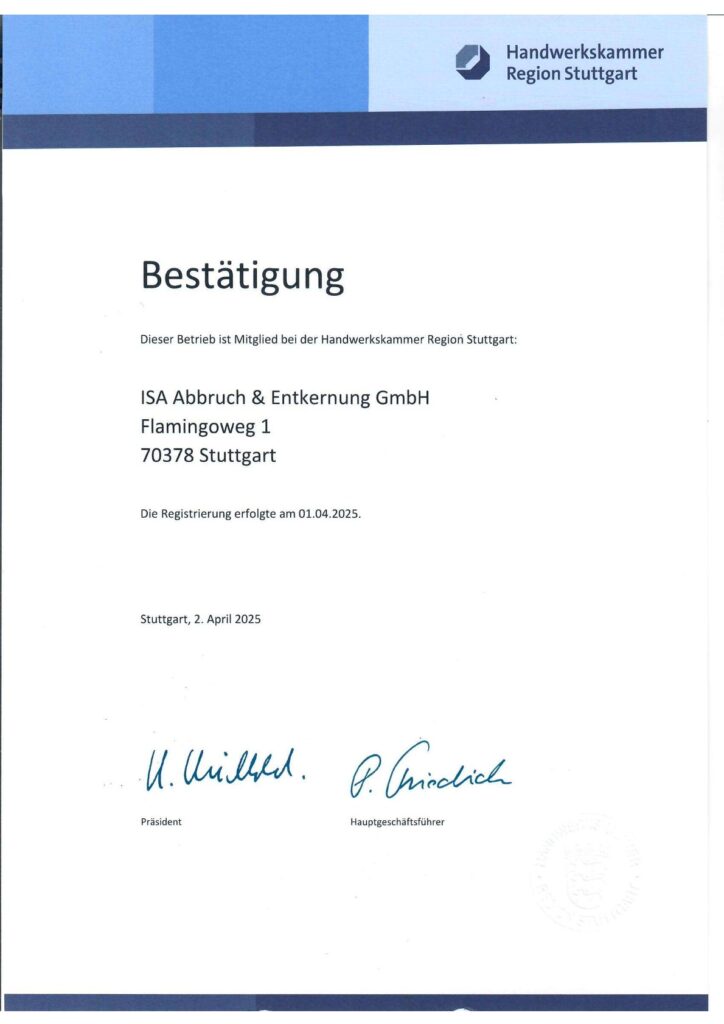 Abbrucharbeiten umfassen den Rückbau, die Entkernung und den vollständigen Abriss ganzer Gebäude oder Gebäudeteile. In Stuttgart dürfen solche Arbeiten nur von zertifizierten Fachbetrieben mit entsprechenden Zulassungen (beispielsweise nach TRGS 519/521) durchgeführt werden. Auch lokale Vorschriften zu Ausbildung und Arbeitssicherheit sind streng zu beachten. Unser Team ist regelmäßig geschult, lokal verwurzelt und verfügt über alle erforderlichen Zulassungen zur Schadstoffsanierung sowie über die offizielle Registrierung beim Gewerbeaufsichtsamt der Landeshauptstadt Stuttgart.